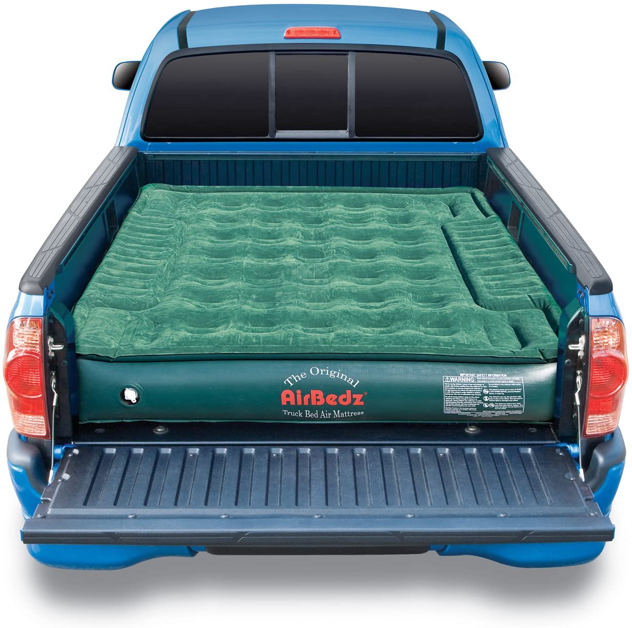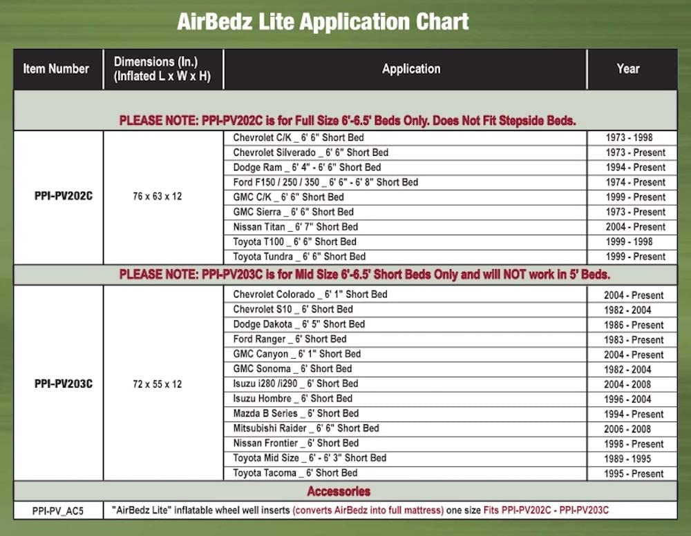 - High Grade PVC Construction. 12 Inches Thick, Fits Mid Size 6-6.5 Inches Truck Beds', "Portable DC Air Pump with 16' Cord Included for mid-size sized 6'-6.5' beds", 'Comfort Coil System evenly distributes weight. Cutouts Allow Mattress To Fit Around & Over Wheel Wells