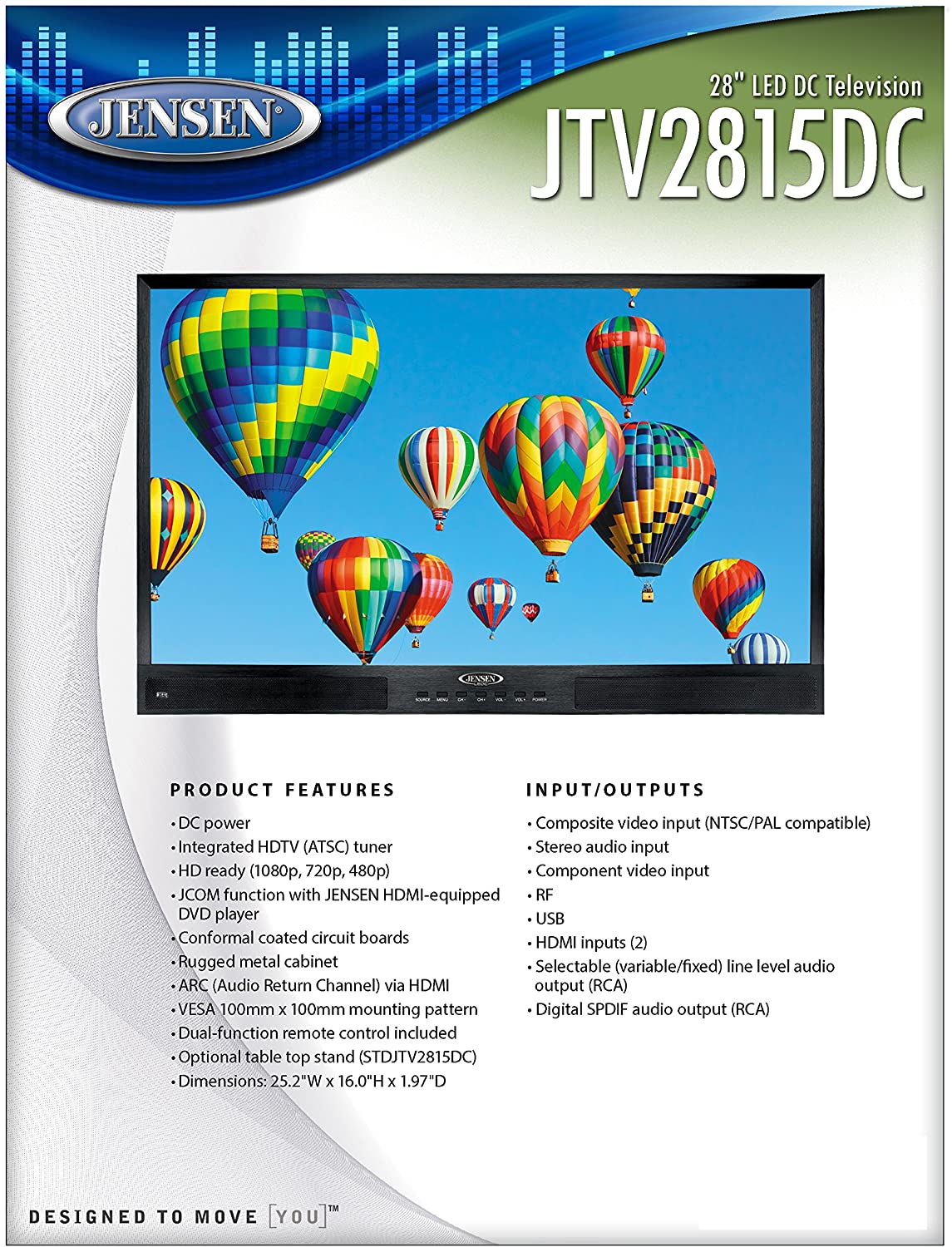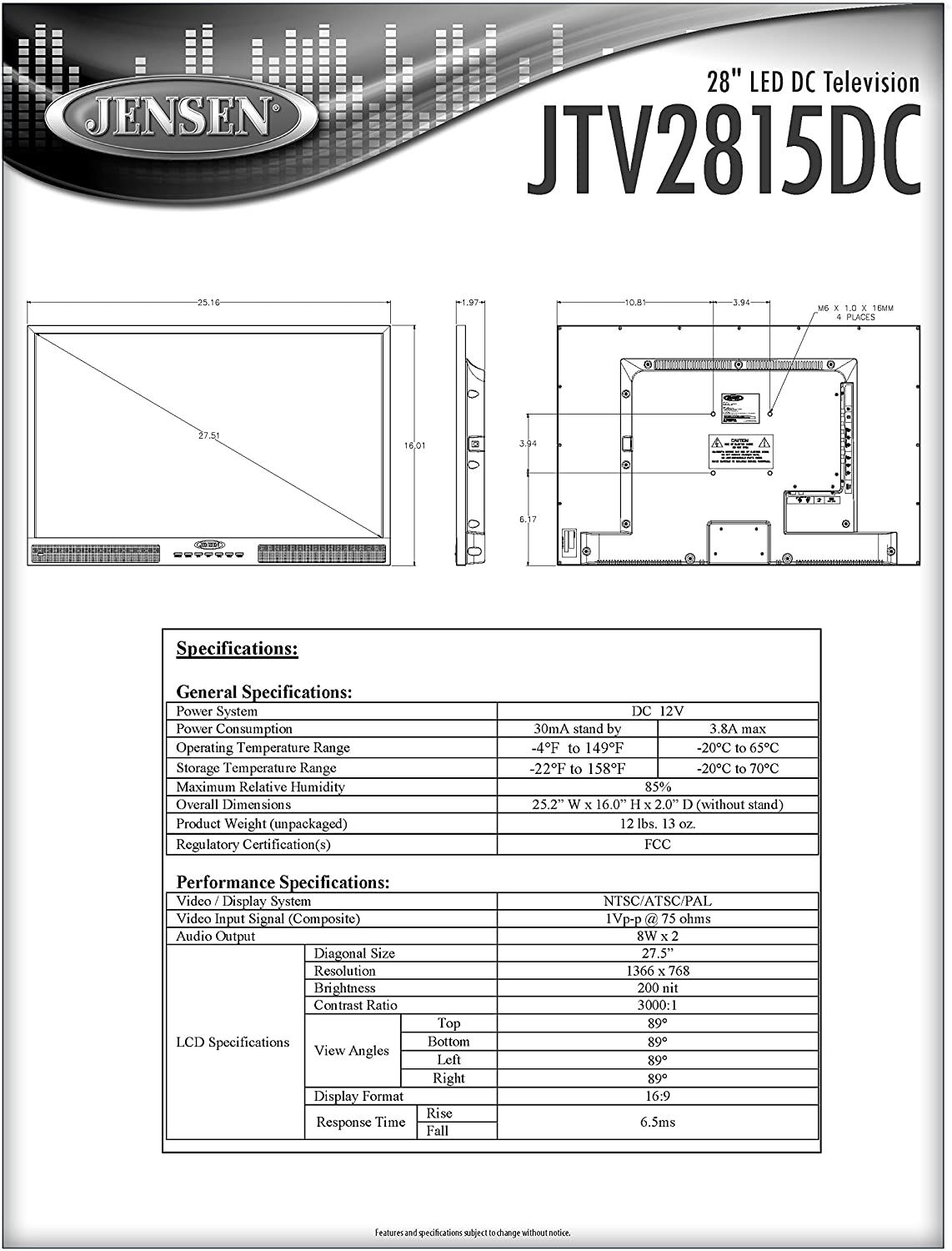 Jensen JTV2815DC 28-Inch LED DC TV with White LED Illumination, Wide 16:9 LCD Panel, 1366 x 768 Pixels WXGA Resolution, and Integrated HDTV (ATSC) Tuner, Black