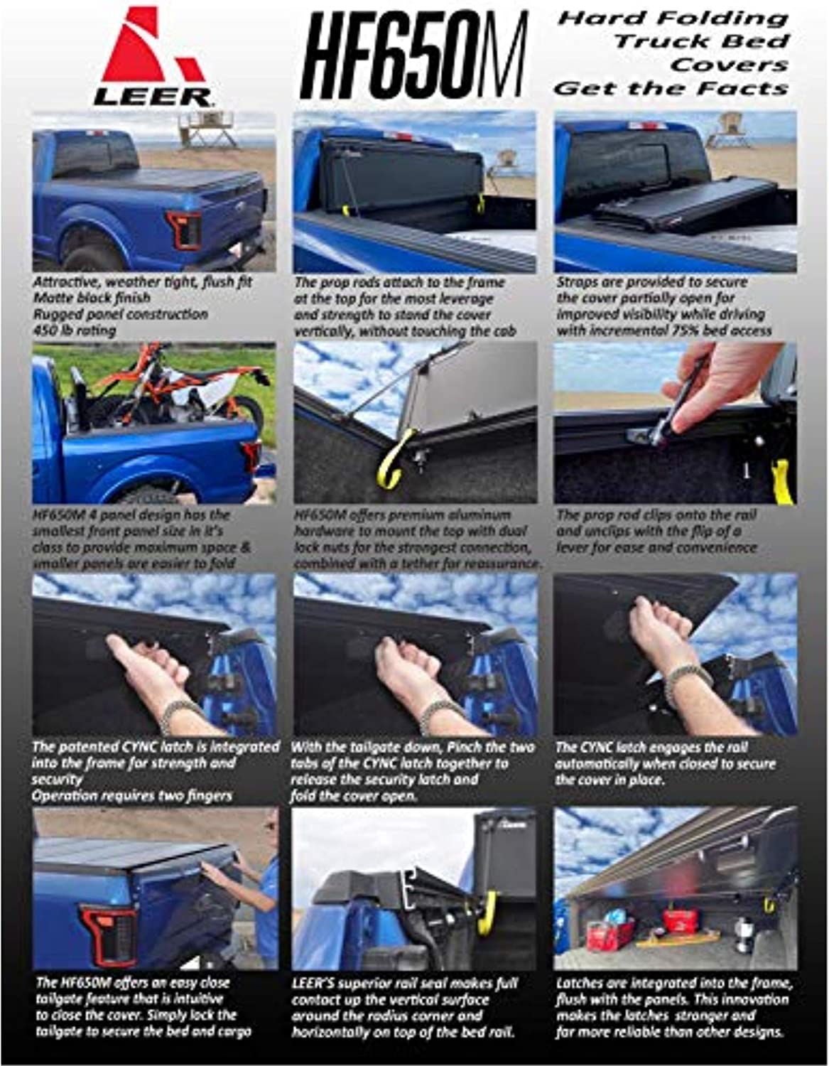 - FITS PERFECT/EASY TO LATCH – LEER’s industry exclusive CYNC latching system allows easily opening the cover with two fingers from either side of the truck bed. Latches with open or closed tailgate.