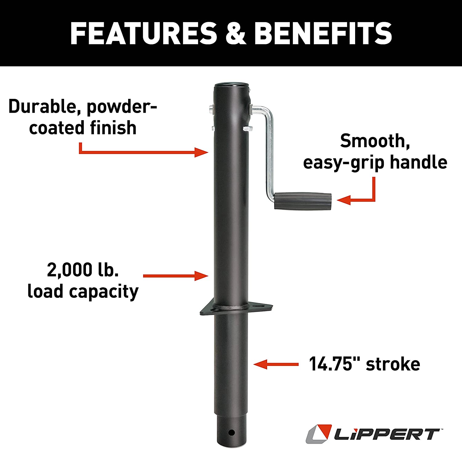 - Heavy-duty gauge steel sidewinder jack raises and lowers trailer with up to 14-3/4" stroke